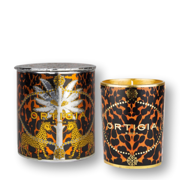 Een gedecoreerde glazen kaarsenhouder van amberkleurige was, rijk aan muskusachtige amber en kruidengeur.