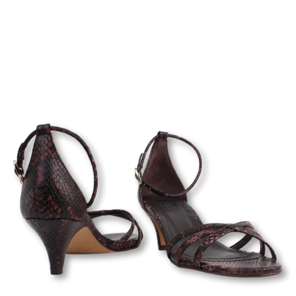 Minimalistisch maar expressief: de RIMA-sandaal is vervaardigd van bruin leer met slangenprint, wat diepte en textuur toevoegt aan het verfijnde silhouet. Delicate bandjes omsluiten de voet perfect, terwijl de middelhoge kittenhak zorgt voor een elegante verhoging, waardoor de sandaal de hele dag comfortabel te dragen is. Een verfijnde keuze voor zomeravonden, elegante outfits of zwierige jurken met een moderne twist.